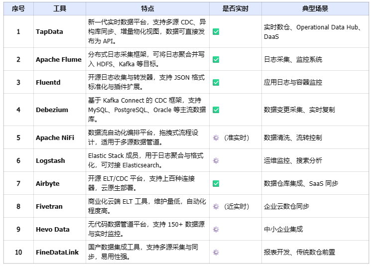 在数据库变更与实时同步场景,应优先考虑 TapData、Debezium、Airbyte 等支持 CDC 的方案。